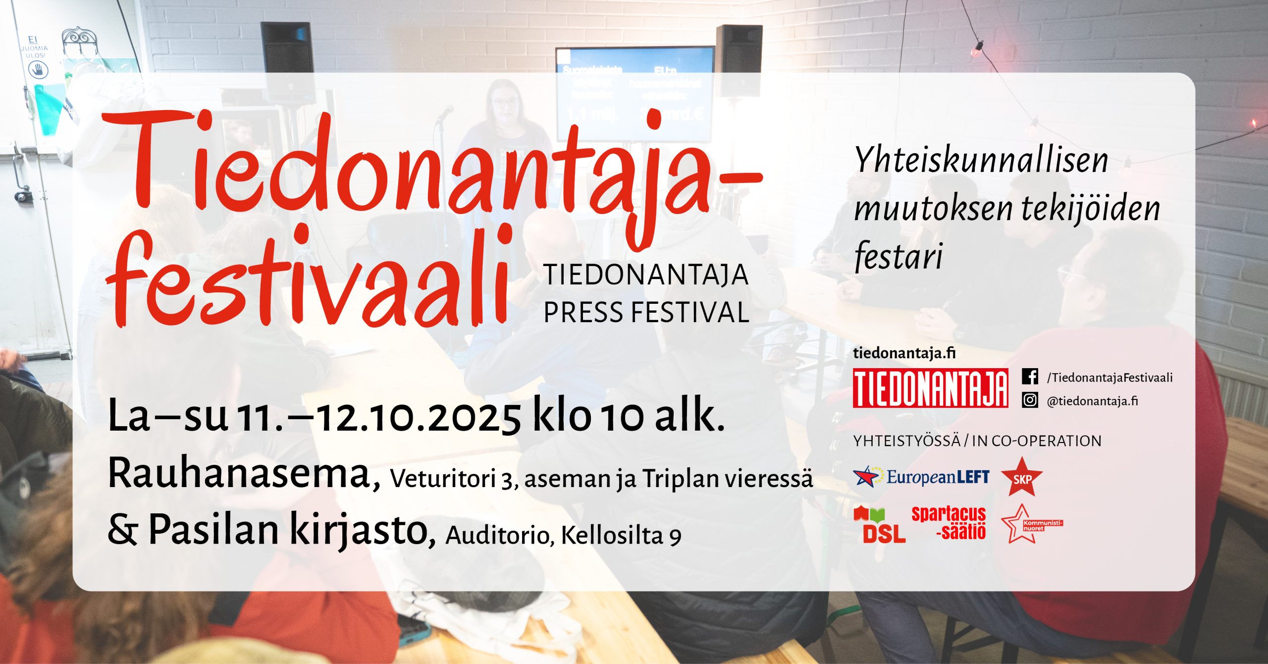 Tiedonantaja-festivaali tulee taas! Tänä vuonna tätä yhteiskunnallisen muutoksen, aktivismin ja yhteistyön festaria vietetään Rauhanasemalla, Helsingin Pasilassa lauantaina ja sunnuntaina 11.-12. lokakuuta! Ohjelmaa järjestetään lauantaina 11. lokakuuta Rauhanaseman lisäksi myös Pasilan kirjaston auditoriossa!